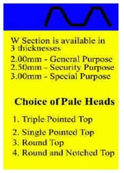 The forbidding appearance and inherent strength of the pales provide an effective deterrent to would be intruders. It is available in a choice of head styles, both in the traditional 'D' pale profile, and 'W' section pale for added security. Palisade is offered in a range of heights up to 3.6 metres, and is self-adjusting to slopes of up to 1 in 3. It can be supplied assembled in panels, or bundled for site assembly along with either bolts or rivets. |